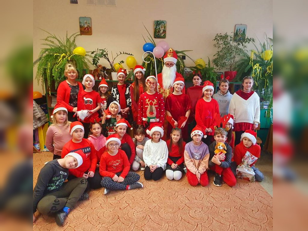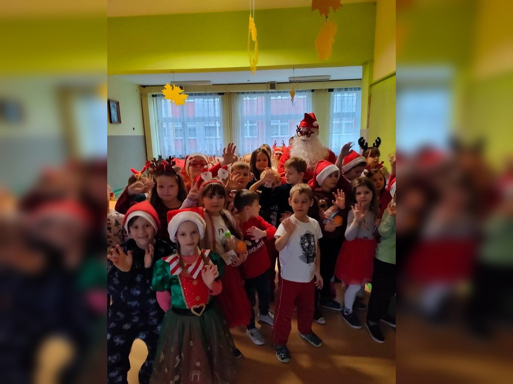 Ten wyjątkowy dzień postanowili uczcić również pierwszoklasiści, będący wychowankami świetlicy. Przy choince pięknie śpiewali piosenki dla Mikołaja, a w nagrodę mali artyści otrzymali od niego słodkie upominki. Wszystkim udzielił się magiczny nastrój, a dekoracje zimowe dodały uroku tej chwili .