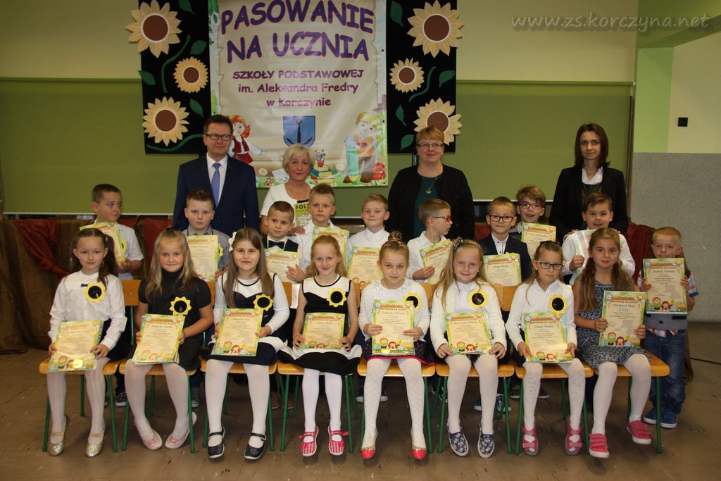 Zgodnie z tradycją Szkoły Podstawowej w Korczynie dnia 30 października 2017 r. odbyła się uroczystość pasowania na ucznia. Przedstawiciel samorządu uczniowskiego gorąco powitał przybyłych gości, a szczególnie bohaterów tego dnia - pierwszoklasistów i ich rodziców. Następnie nasi mali artyści zaprezentowali swoje umiejętności recytatorskie i wokalne. Odpowiadali na pytania zadawane im przez starszych kolegów, wykazali się również wiedzą na temat swojej ojczyzny i znajomością zasad obowiązujących w szkole. Gdy już wszystkie zadania zostały wykonane, dzieci złożyły uroczyste ślubowanie. Po nim nastąpiło to, na co wszyscy czekali najbardziej- pasowanie pierwszoklasistów na uczniów przez dyrektora Szkoły Podstawowej w Korczynie - p. Artura Stodolaka.