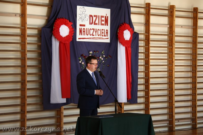 Uroczystą akademię rozpoczął dyrektor - pan Artur Stodolak, który przywitał zgromadzonych gości: wójta Gminy Korczyna Jana Zycha, Wojciecha Ignarskiego - przewodniczącego Rady Rodziców, emerytowanych nauczycieli, dyrektora i pracowników obsługi oraz całą społeczność uczniowską. W swoim wystąpieniu podkreślił ogromne znaczenie nauczycieli w kształtowaniu postaw i umysłów młodego pokolenia, wychowaniu ich w poszanowaniu tradycji i historii kraju. Zaznaczył, że nauczyciel powinien być autorytetem dla swoich uczniów, wykazując się cierpliwością, życzliwością oraz kulturą osobistą.