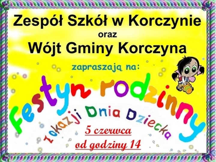 W niedzielę - 5 czerwca 2016 r. o godzinie 14.00 - na terenie obiektów korczyńskiej szkoły zrobiło się radośnie, gwarno i kolorowo, ponieważ tego dnia Zespół Szkół w Korczynie oraz wójt gminy Korczyna zorganizowali Festyn Rodzinny z okazji Dnia Dziecka.
