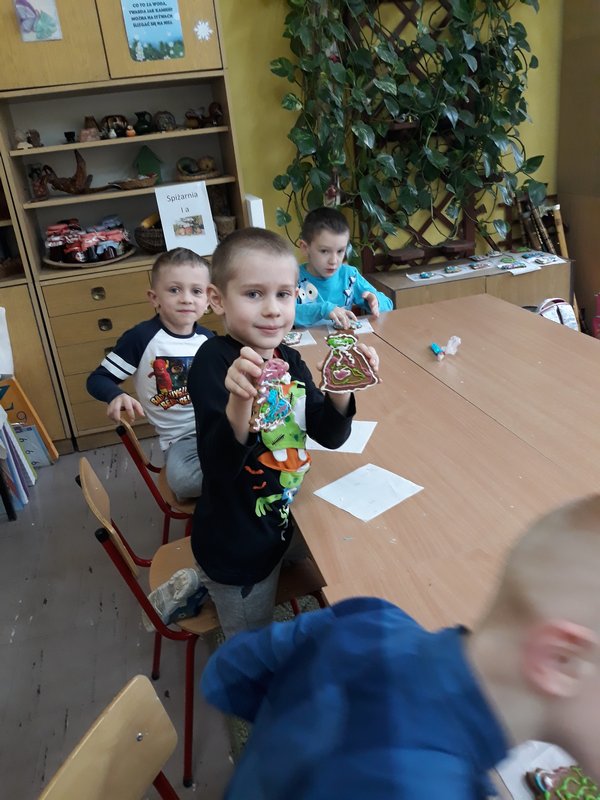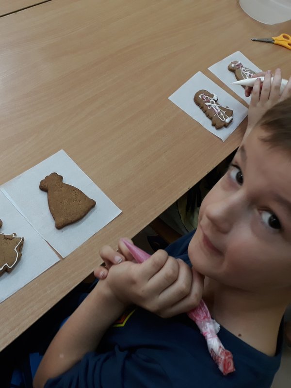 Śpiewając kolędy wszyscy wzięliśmy się do pracy i najpiękniej jak potrafiliśmy lukrowaliśmy słodycze. Wyglądały bardzo ładnie i pysznie, w związku z tym nie mogliśmy się oprzeć i część z nich po prostu zjedliśmy.
