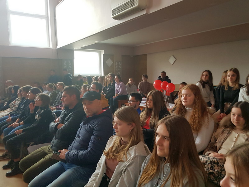 Następnie głos zabrał Kamil Klatka – dwukrotny dawca komórek macierzystych. Opowiedział zebranym, jak doszło do tego, że zarejestrował się w bazie DKMS. Podkreślił również, że sam zabieg jest zupełnie bezbolesny, a satysfakcja, jaką daje świadomość, że uratował życie dwóm osobom – bezcenna. Zadeklarował oczywiście swoją gotowość do kolejnych pobrań. Po wysłuchaniu historii pana Kamila nasi uczniowie zadali mu szereg pytań dotyczących towarzyszących mu emocji, przebiegu samego pobierania komórek oraz okoliczności, w jakich dowiadywał się, że może zostać dawcą.