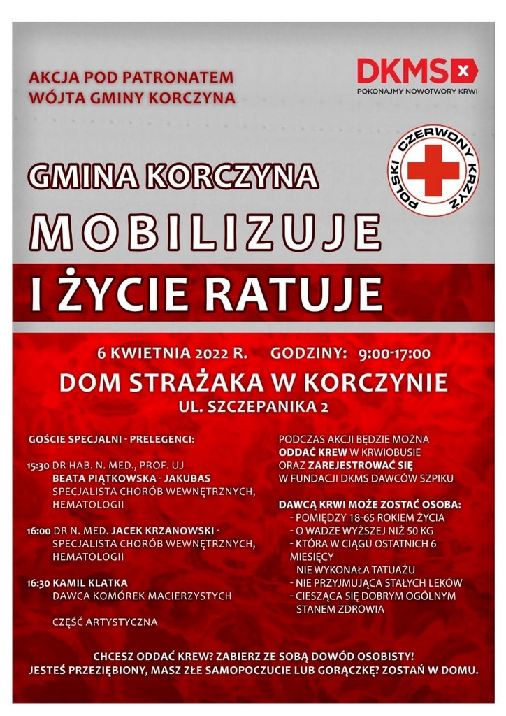 6 kwietnia 2022r. uczniowie Szkoły Podstawowej w Korczynie włączyli się w akcję "GMINA KORCZYNA MOBILIZUJE I ŻYCIE RATUJE". 67 ósmoklasistów wraz z nauczycielami wysłuchało wykładu doktora nauk medycznych Jacka Krzanowskiego na temat diagnozowania i przebiegu białaczki oraz jej leczenia. Prowadzący przybliżył zebranym kwestię dawstwa krwiotwórczych komórek macierzystych oraz szpiku. Szczegółowo omówił sam proces ich pozyskiwania oraz wskazał, kto może zostać potencjalnym dawcą. Po zakończeniu prelekcji uczniowie zadali bardzo dużo pytań, co dowodzi, że byli żywo zainteresowania tematem.