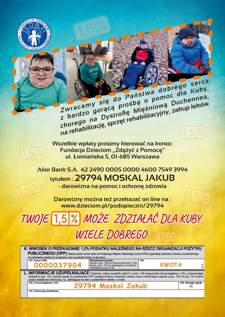 Tym razem Szkolne Koło Wolontariatu- pod opieka p. Alicji Pudło i p. Ewy Sikory - zorganizowało "SŁODKI DZIEŃ", z którego dochód ma wspomóc rehabilitację młodego mieszkańca Korczyny - Kubusia. Chłopiec cierpi na bardzo poważną chorobę – dystrofię mięśniową Duchenne'a. Jego mięśnie słabną i trudno mu się poruszać. Pieniądze uzyskane ze sprzedaży słodkości pomogą w rehabilitacji chłopca i w zakupie nowego wózka.