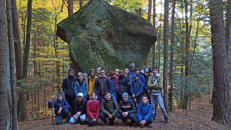 Wymarsz nastąpił spod "Konfederatki" - wychodni skalnej przypominającej kształtem rogatywkę konfederatów barskich. Konfederacja barska utworzona w roku 1768, skierowana przeciwko Rosji miała na celu obronę wiary katolickiej i niepodległości Rzeczypospolitej. Kolejnym punktem wyprawy była góra Połom - jedno z najbardziej tajemniczych miejsc podkarpacia. Magiczne wzgórze, będące od zarania dziejów miejscem kultu religijnego skrywa wśród drzew wiekową kapliczkę oraz wspaniałą, wykonaną z królującego na tym terenie piaskowca rzeźbę, przedstawiająca figurę św. Piotra dzierżącego klucze do Raju. Następnym etapem naszej wyprawy były "Zaginione Skałki" i pomnik przyrody "Trzy Wody" . Ten fragment trasy pozwolił zasmakować  nam jedynej i niepowtarzalnej polskiej jesieni.
